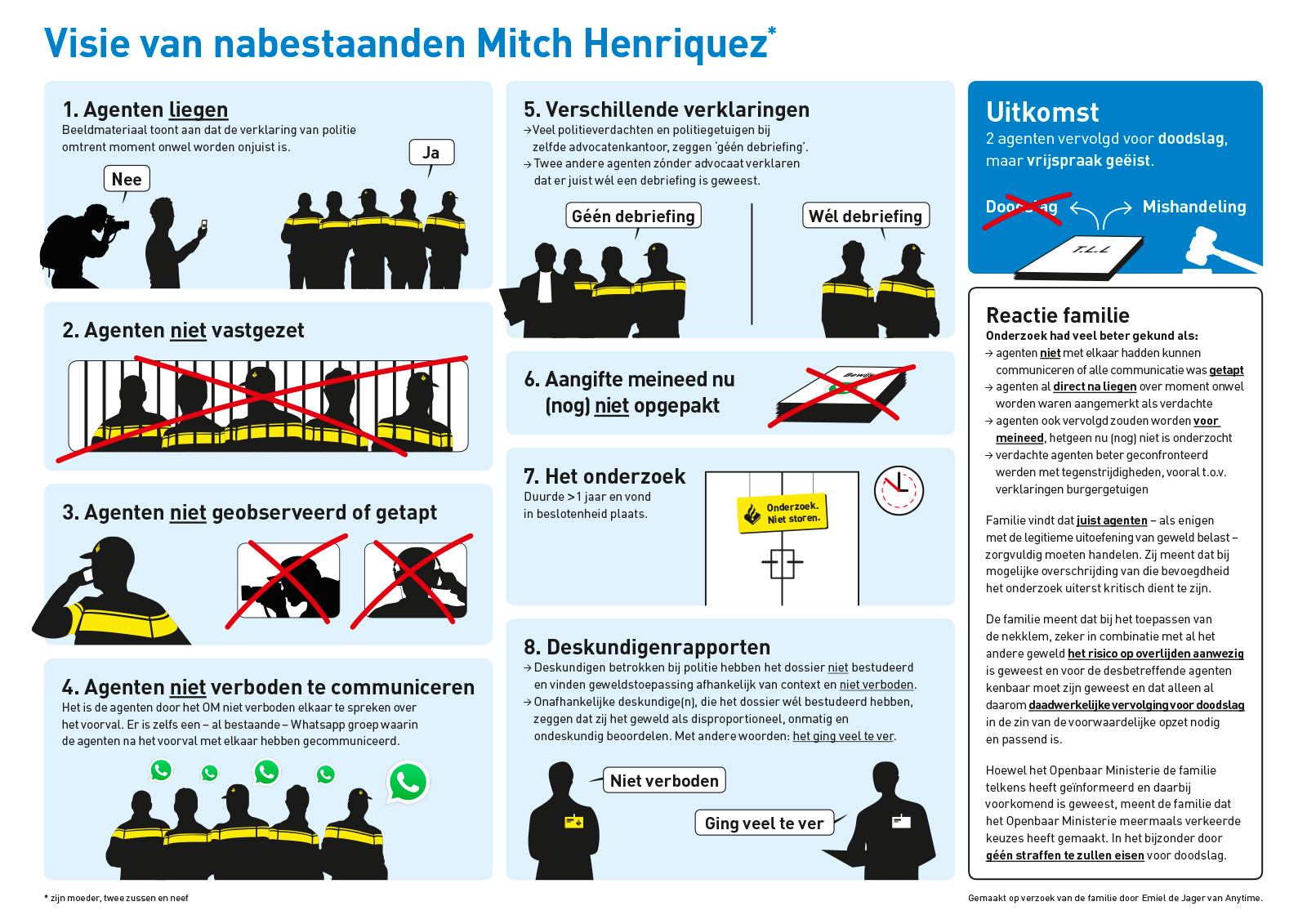 Op hun verzoek is één en ander gevat in een zogenoemde infographic die u hierboven afgebeeld ziet. Belangrijkste is dat het Openbaar Ministerie weliswaar wel doodslag op de tenlastelegging zet voor de twee agenten die worden vervolgd, maar al heeft aangegeven bij de huidige stand van het onderzoek te zullen requireren tot vrijspraak voor dat feit.