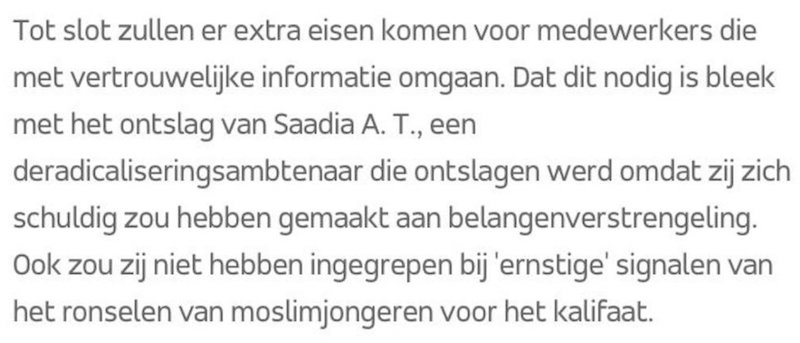 Voormalig anti-radicaliseringsambtenaar Saadia Ait Taleb heeft met ontzetting kennisgenomen van de berichtgeving van AT5. Zij ontkent ten stelligste dat zij ernstige signalen ten aanzien van ronselen voor het kalifaat heeft gemist. Wel stelt zij dat politie justitie niet altijd opvolging hebben gegeven aan de signalen die door haar werden doorgegeven.